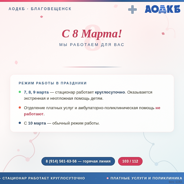 7, 8 и 9 марта стационар больницы работает в штатном круглосуточном режиме — оказывается экстренная и неотложная помощь детям.